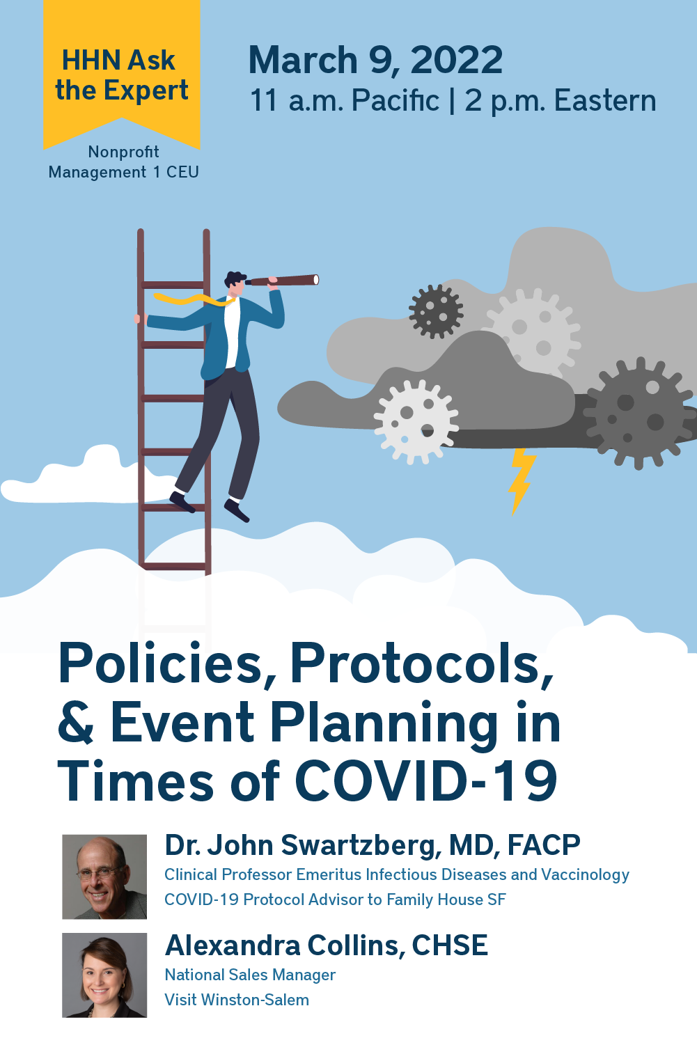 We are now in the second year of trying to make informed decisions about the best protocols and practices to have in place in response to COVID-19. What a rollercoaster ride it has been! Especially as it relates to the special events our members count on to engage local communities in their annual friend-raising and fundraising goals. Join us as we get the latest updates and guidance from Dr. John Swartzberg, Clinical Professor Emeritus Infectious Diseases and Vaccinology, and advisor to Family House SF on COVID-19 protocols, and, Alexandra Collins, CHSE, who will share insights on planning and preparing for events in the year ahead.